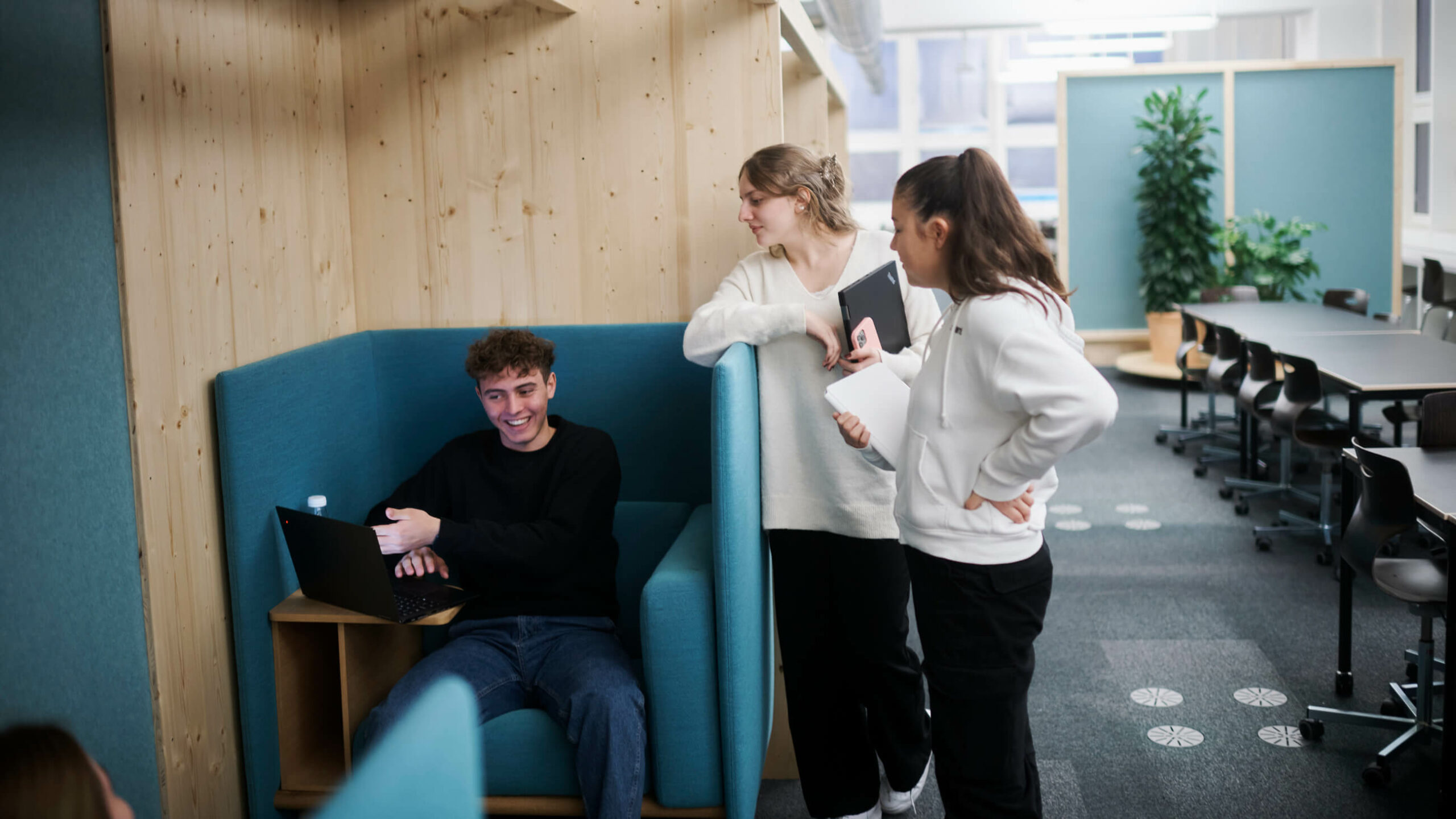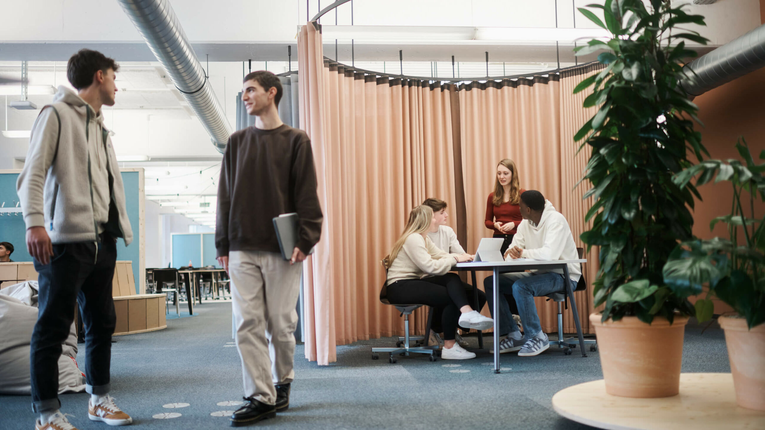 Diese Lernlandschaft ist in verschiedene Zonen unterteilt, die durch mobile Akustikwände voneinander getrennt sind. Diese Wände ermöglichen eine flexible Anpassung der Umgebung an die jeweiligen Bedürfnisse und Aktivitäten. Ob konzentriertes Lernen, kreatives Denken, Gruppenarbeit oder Selbststudium – die Loft School bietet Raum für alles. Bequeme Sitzsäcke laden zum Entspannen und Ideenaustausch ein, während in anderen Bereichen traditionelle Sitzgelegenheiten für formelleres Lernen und Diskussionen zur Verfügung stehen.